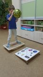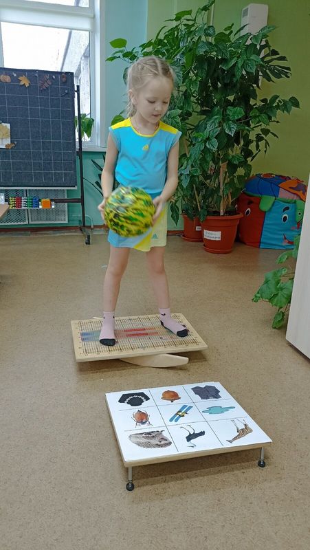 «Меткий бросок». Стоя на доске, ребёнок кидает мяч в мишень и называет слог или слово с нужным звуком.